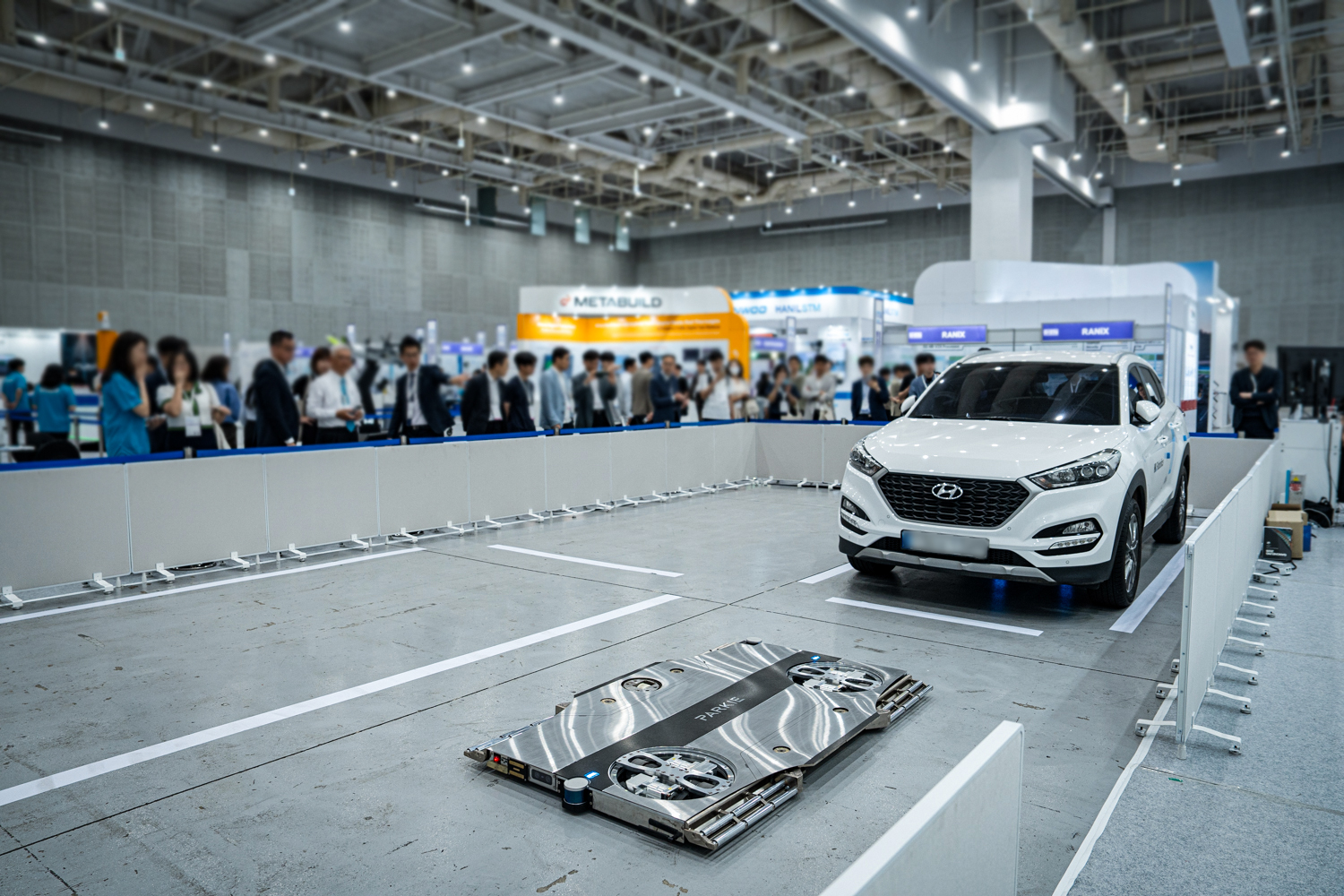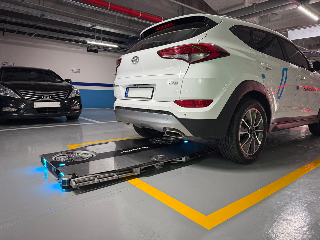 로봇 주변의 장애물, 빈 공간, 주행로 등을 스스로 인식해 주행하고 차량 바퀴 사이의 거리, 차량 중심을 파악해 차량을 들고 이동합니다.